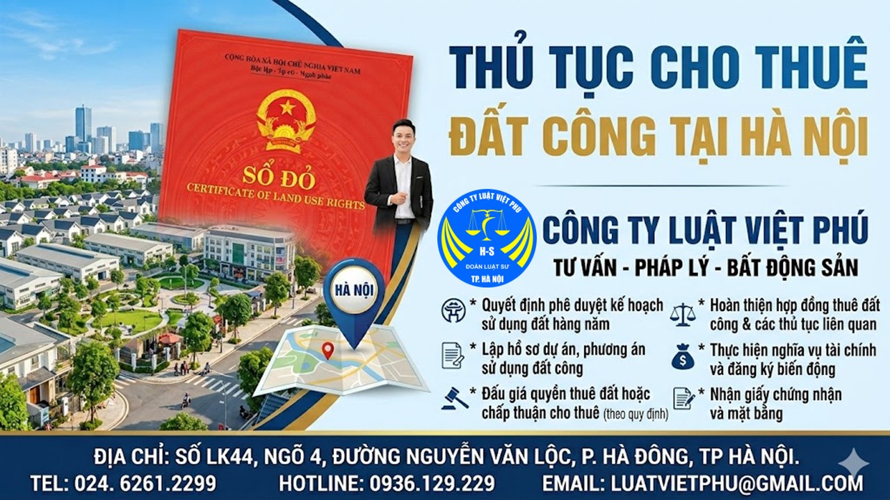 Tóm lại, thủ tục cho thuê đất công tại Hà Nội đòi hỏi sự chuẩn bị kỹ lưỡng và tuân thủ pháp luật để đạt kết quả tốt nhất. Từ điều kiện, quy trình đến giá thuê, mọi khía cạnh đều góp phần vào sự phát triển bền vững của thành phố. Để hỗ trợ thêm, hãy liên hệ Công ty luật Việt Phú tại địa chỉ Số LK44, Ngõ 4, Đường Nguyễn Văn Lộc, P. Hà Đông, TP Hà Nội, với số điện thoại 024.6261.2299 hoặc email luatvietphu@gmail.com. Việc áp dụng các quy định mới về thuê đất công sẽ mang lại lợi ích lâu dài cho tất cả các bên liên quan.